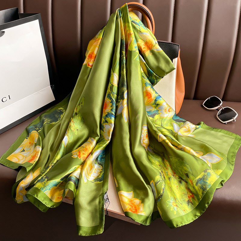 Khăn choàng lụa cao cấp màu xanh họa tiết hoa sen làm quà tặng bạn gái, sếp nữ, mẹ, cô, dì, chị – em gái…