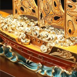 Lớp mạ vàng 24K bao phủ toàn bộ chi tiết kim loại – từ cánh buồm, dây neo đến lan can tàu – không chỉ tăng thêm độ sang trọng mà còn giúp chống oxy hóa, giữ vẻ đẹp bền bỉ theo thời gian.